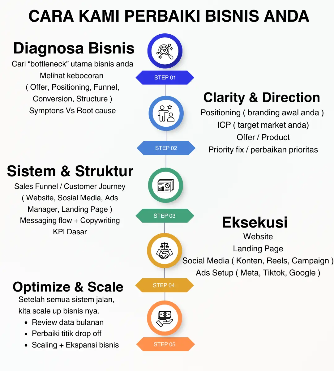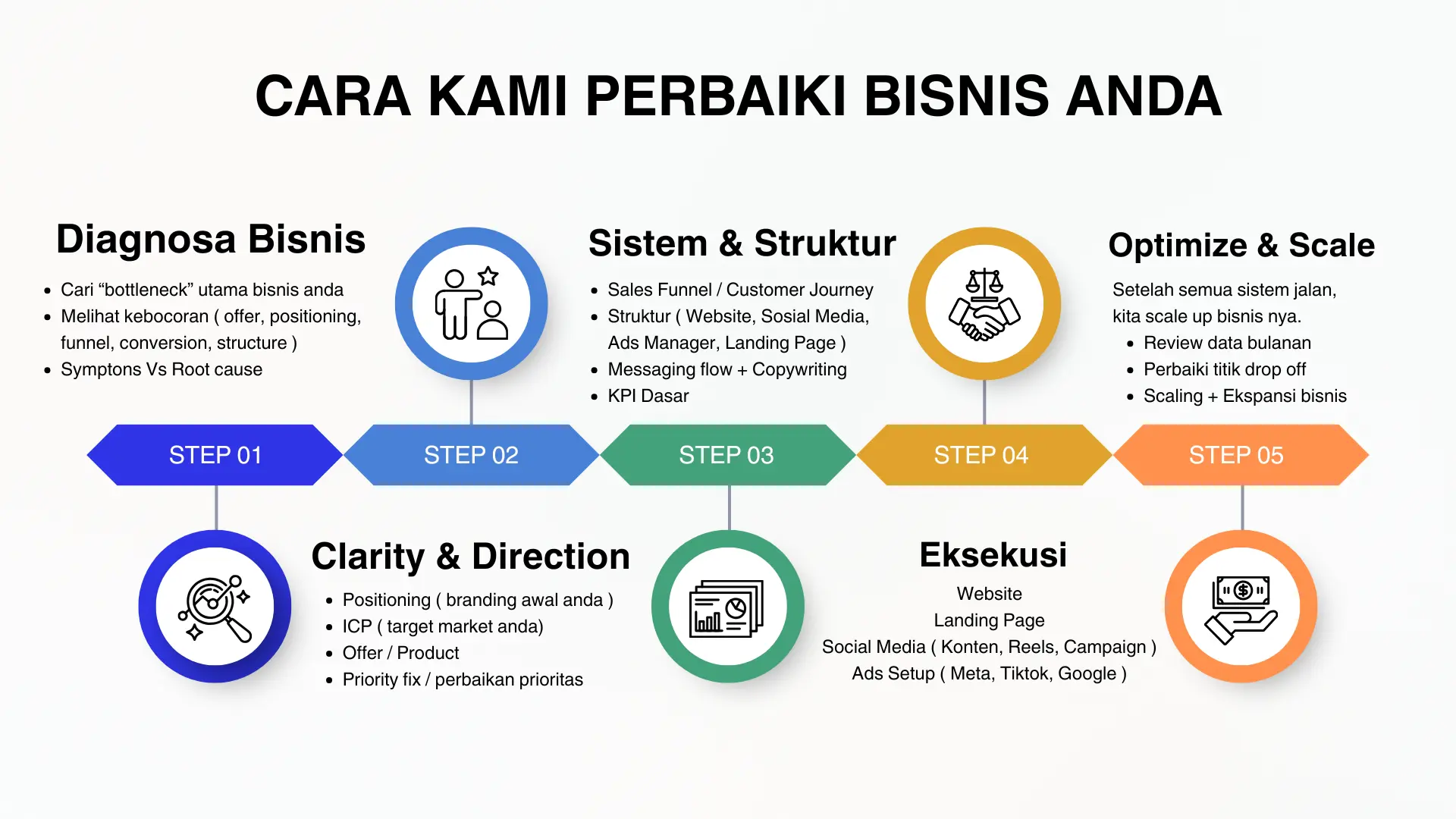 Jevolve membantu Anda menemukan dan memperbaiki masalah inti, mulai dari strategi, funnel penjualan, messaging, struktur operasional, hingga arah bisnis yang tidak selaras.